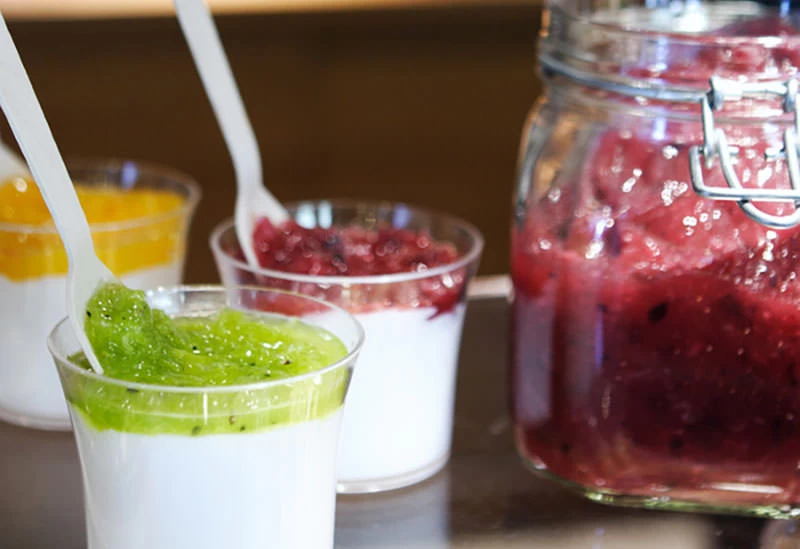 「茶論 記憶(さろん きをく)」は、映画館に併設されているカフェで、映画鑑賞後の余韻にひたれる落ち着いた空間が広がります。お店はセルフスタイルとなっており、カウンターで注文したドリンクを、自身でイートインコーナーに運びます。店内は、白い壁に木製の家具を配したお洒落な雰囲気で、ゆっくり寛げるテーブル席が設けられています。名物メニューは、旬の食材で作る色とりどりの「手毬寿司」。季節に合わせた全7種類の味が揃い、ひとつからでも注文できます。