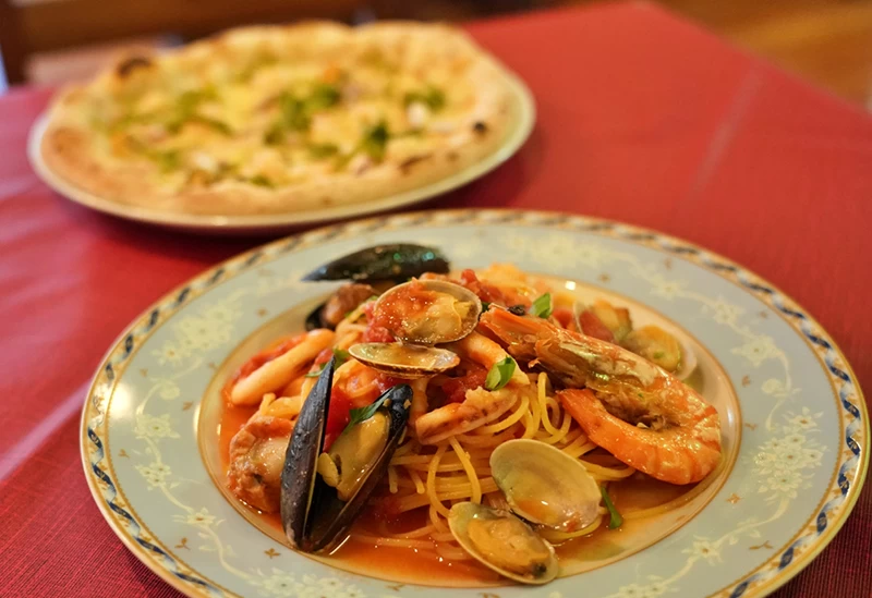 伊勢・鳥羽・志摩の旬の食材を活かしたイタリア料理が味わえる一軒。伊勢エビや牡蠣、あおさのり(ヒトエグサ)、しらすを使ったピザやパスタ、志摩ブランド認定品「パールポークほろよい」を赤ワインソースで味わうスペアリブなど、素材の魅力が際立つメニューが並びます。ワインも豊富で、定番ドルチェ「ティラミス」など自家製デザートも好評。お酒とともに楽しむランチから食後のデザートまで揃い、さまざまなシーンで利用できます。