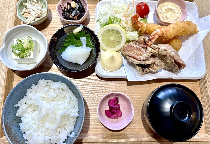近畿日本鉄道鵜方駅から徒歩圏内にある「原八食堂」。三重県津市が発祥の「天むす」「天巻き」、松阪市のソウルフード「鶏焼き肉」など、多彩なご当地グルメが揃っています。ランチでは、ボリューム満点の定食メニューを中心に提供。「えびあおさコロッケ」や、郷土料理の伊勢うどんに天むすが付いた名物の掛け合わせ定食などが楽しめます。店内は木のぬくもりあふれる落ち着いた空間で、個室も完備。伊勢志摩ならではの逸品を味わいに、ぜひ訪れてみてください。
