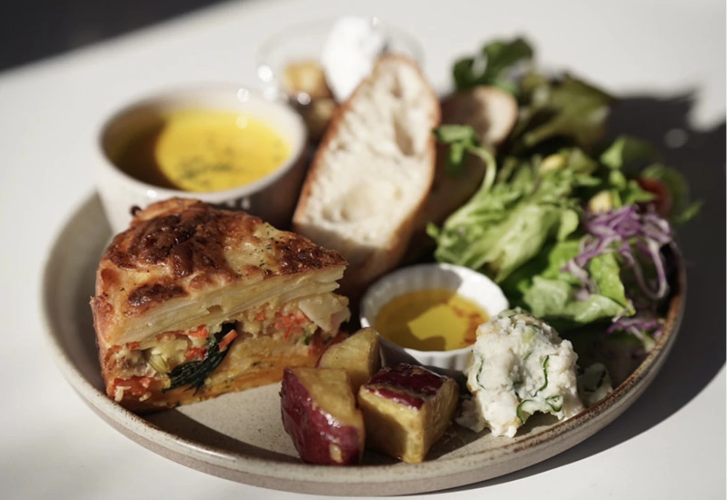 「Pie Chefs Kitchen HOLY PLACE(パイ シェフズ キッチン ホーリー プレイス)」は、コンセプトに“パイの聖地”を掲げるパイ料理専門店です。看板メニューは「アップルパイ」で、ザクザクとした食感の生地に、リンゴのフィリングがぎっしり詰まっています。「ビーフミートパイ」や「サーモンとほうれん草のクリームパイ」などの惣菜パイや、季節のフルーツを使った限定パイも人気です。イートインスペースで焼きたてを味わえるほか、テイクアウトして手土産にするのもおすすめです。