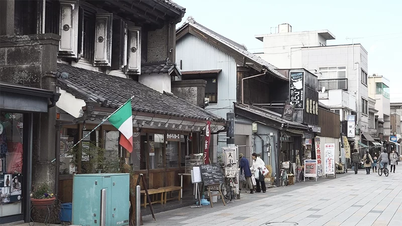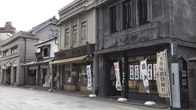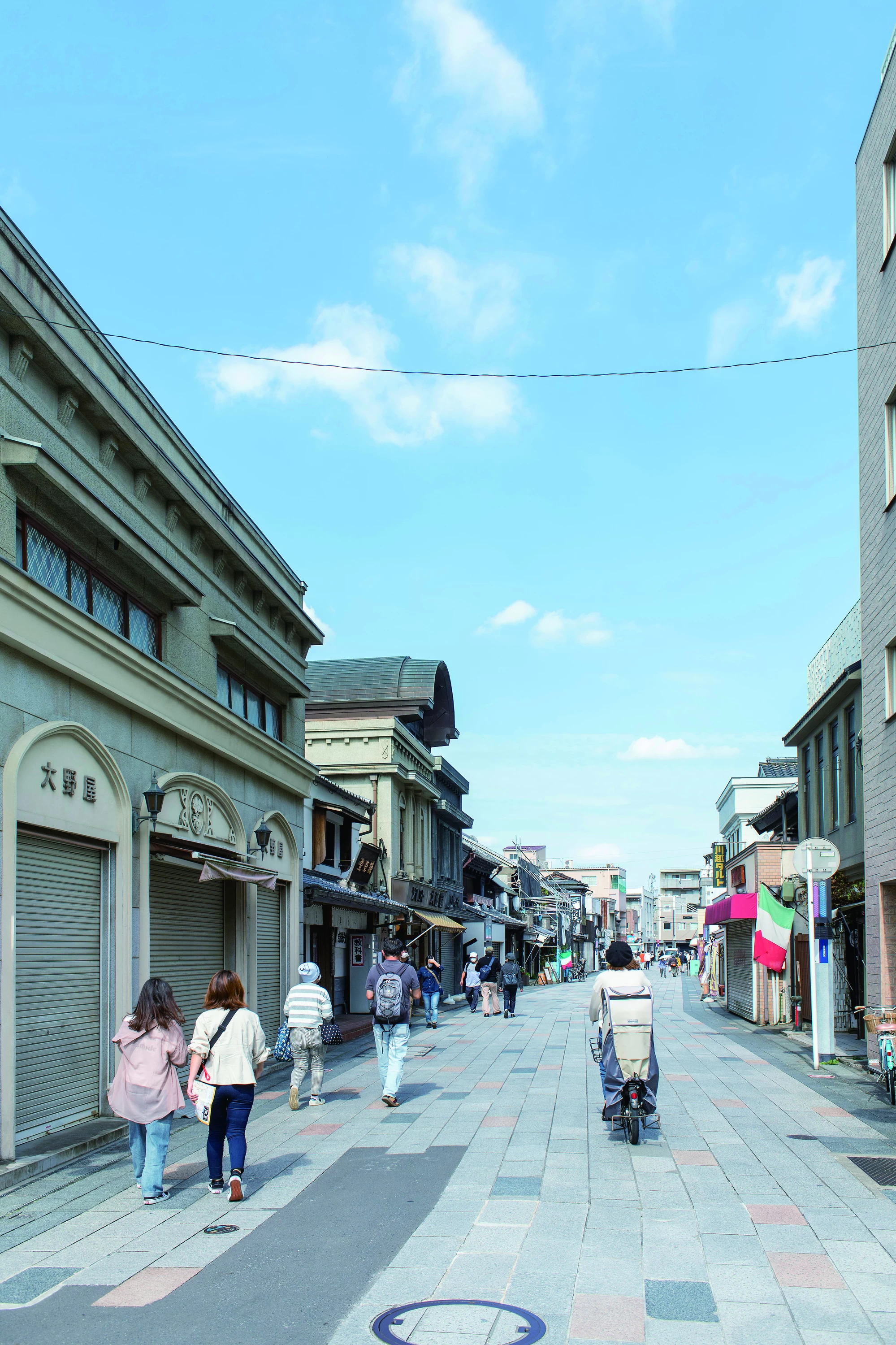 「大正浪漫夢通り」は、石畳が敷かれた大正時代の趣が色濃く残る、川越屈指の人気スポットです。洋風建築の建物が軒を連ねるレトロな町並みは、映画やドラマのロケ地にも利用されました。通りには、着物レンタル店や日用品・お土産などを扱う個性豊かな店舗があり、散策と買い物を一度に満喫できます。夜間は、やわらかい明かりの街灯が商店街を照らし、落ち着いた雰囲気に。春には通りの空を泳ぐ鯉のぼりも魅力的です。