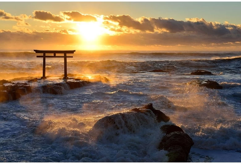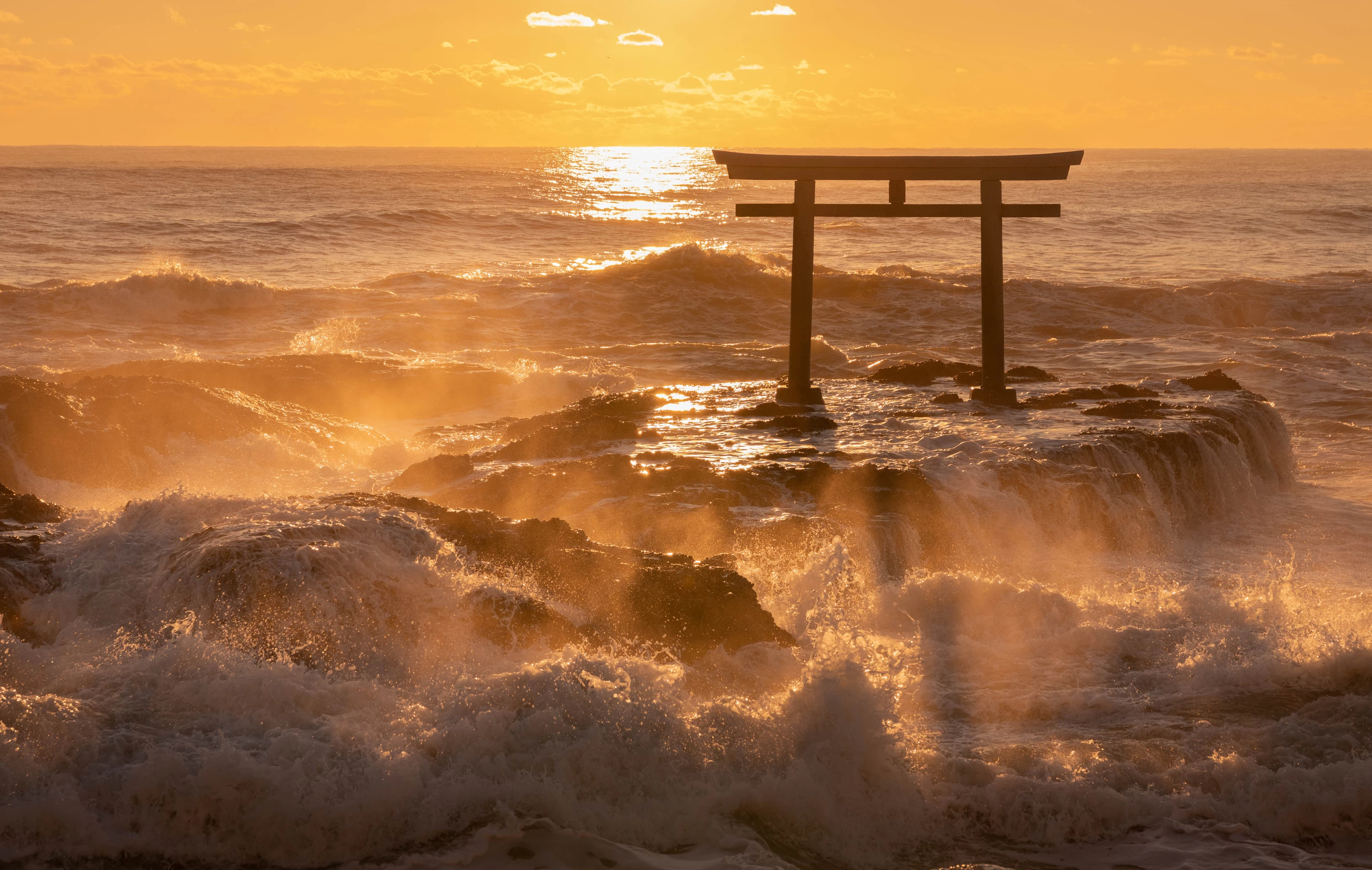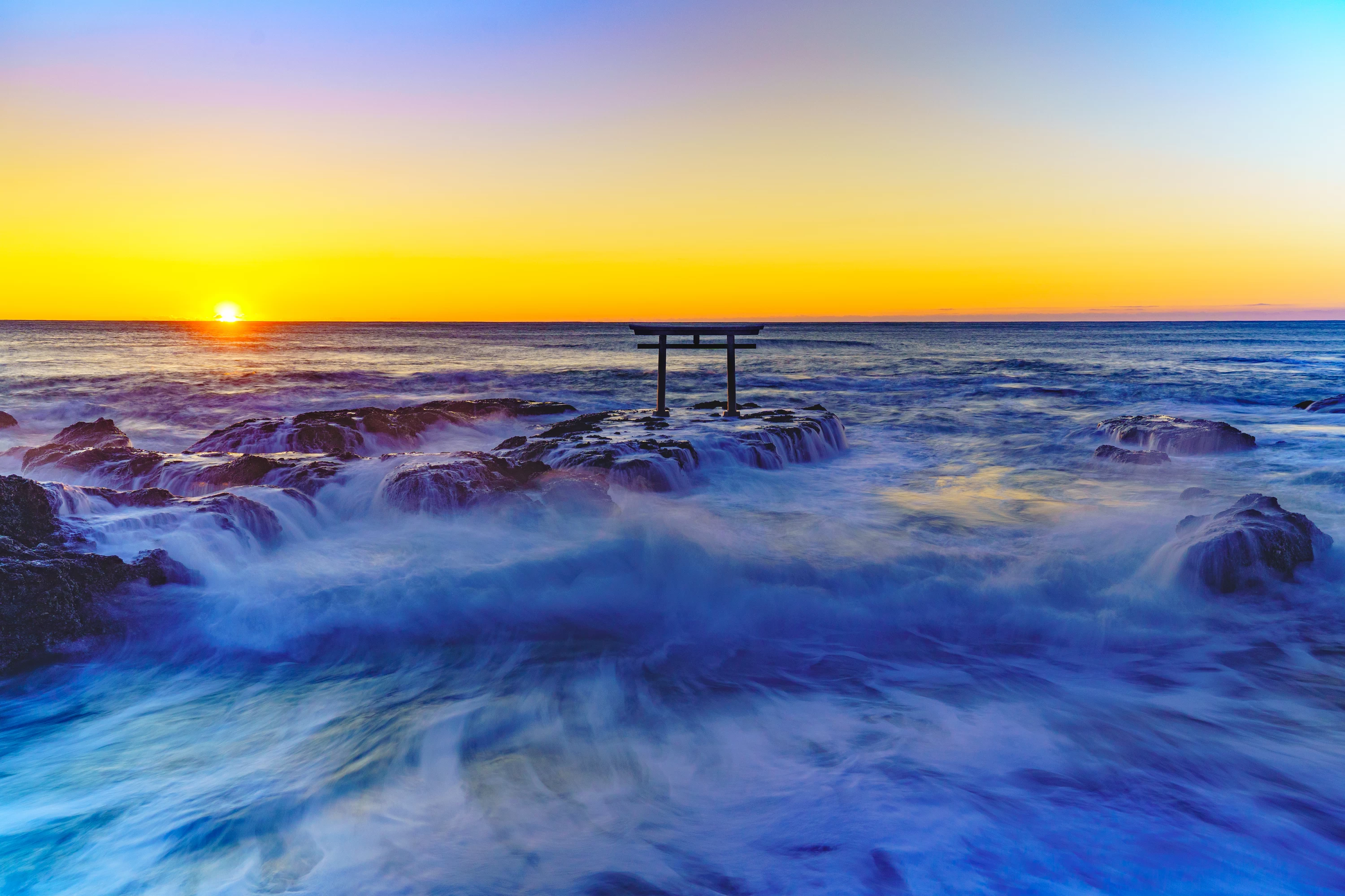 大洗県立自然公園内にある海岸で、波が押し寄せる岩場に立つ「神磯の鳥居」があることで有名。「日本の渚100選」や「日本の白砂青松百選」にも選出されており、風光明媚な景観を眺められます。岩礁に当たって白い飛沫を上げる波や、水平線から昇る太陽に鳥居が照らされる様子は、息を飲むほど神秘的な光景。多くのフォトグラファーも足を運ぶ景勝地として有名です。岩礁が多いことから遊泳は禁止されています。磯遊びや白い砂浜の散歩、写真撮影など思い思いに過ごしましょう。