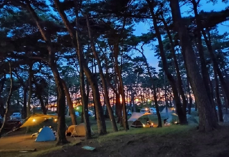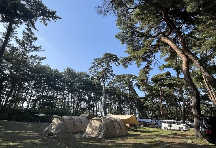 松林に囲まれた広大なキャンプ場。フリーサイトのため、サイトアレンジを自由自在に楽しめます。コンビニやスーパーが徒歩圏内にあるため、気軽に食材など必要なものの買い出しが可能です。海鮮市場や海水浴場、水族館にも近いため、観光拠点としても好立地。都会の喧騒を離れて自然のなかで過ごす時間は、2人の距離をぐっと近づけてくれるはずです。