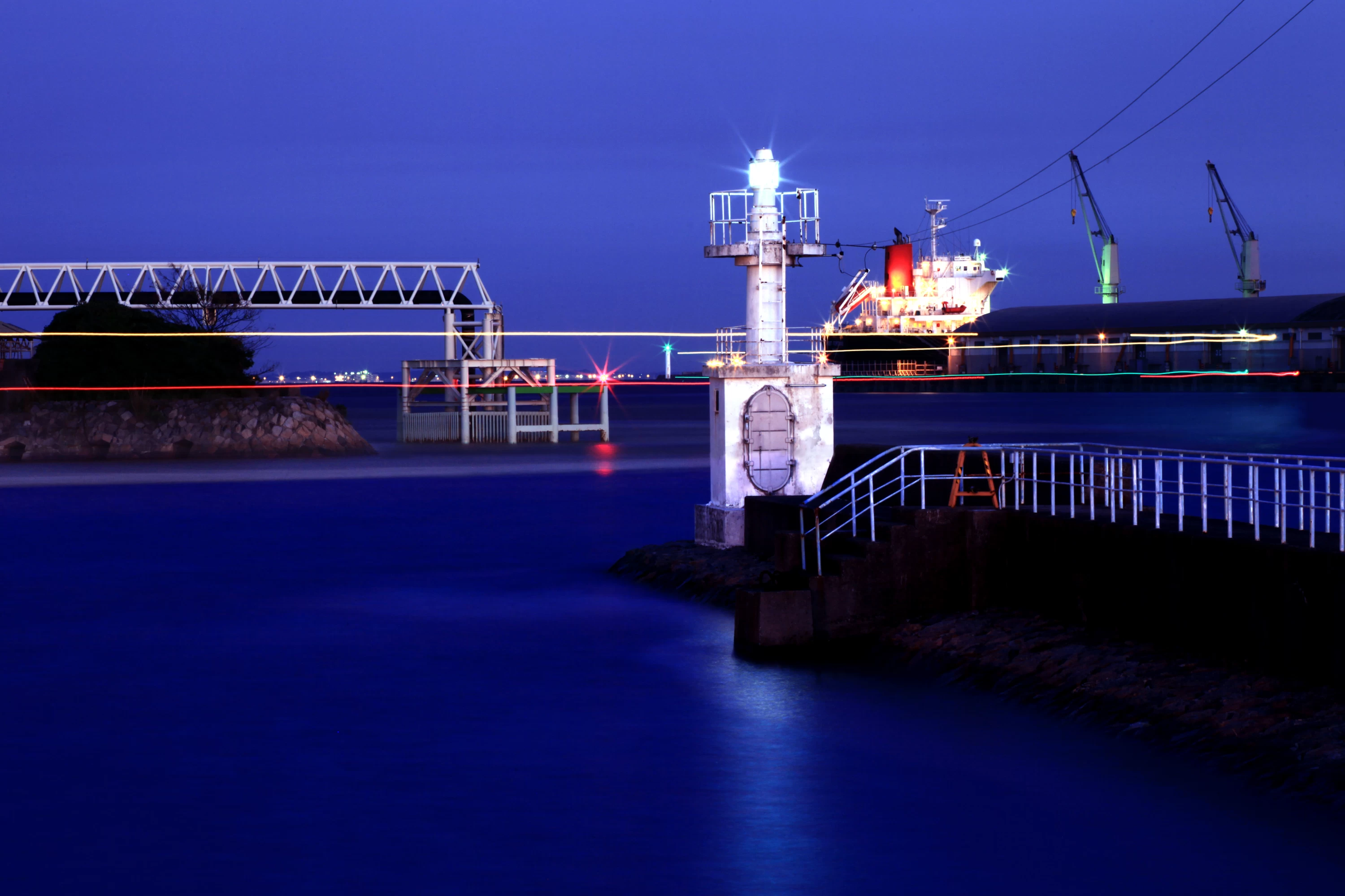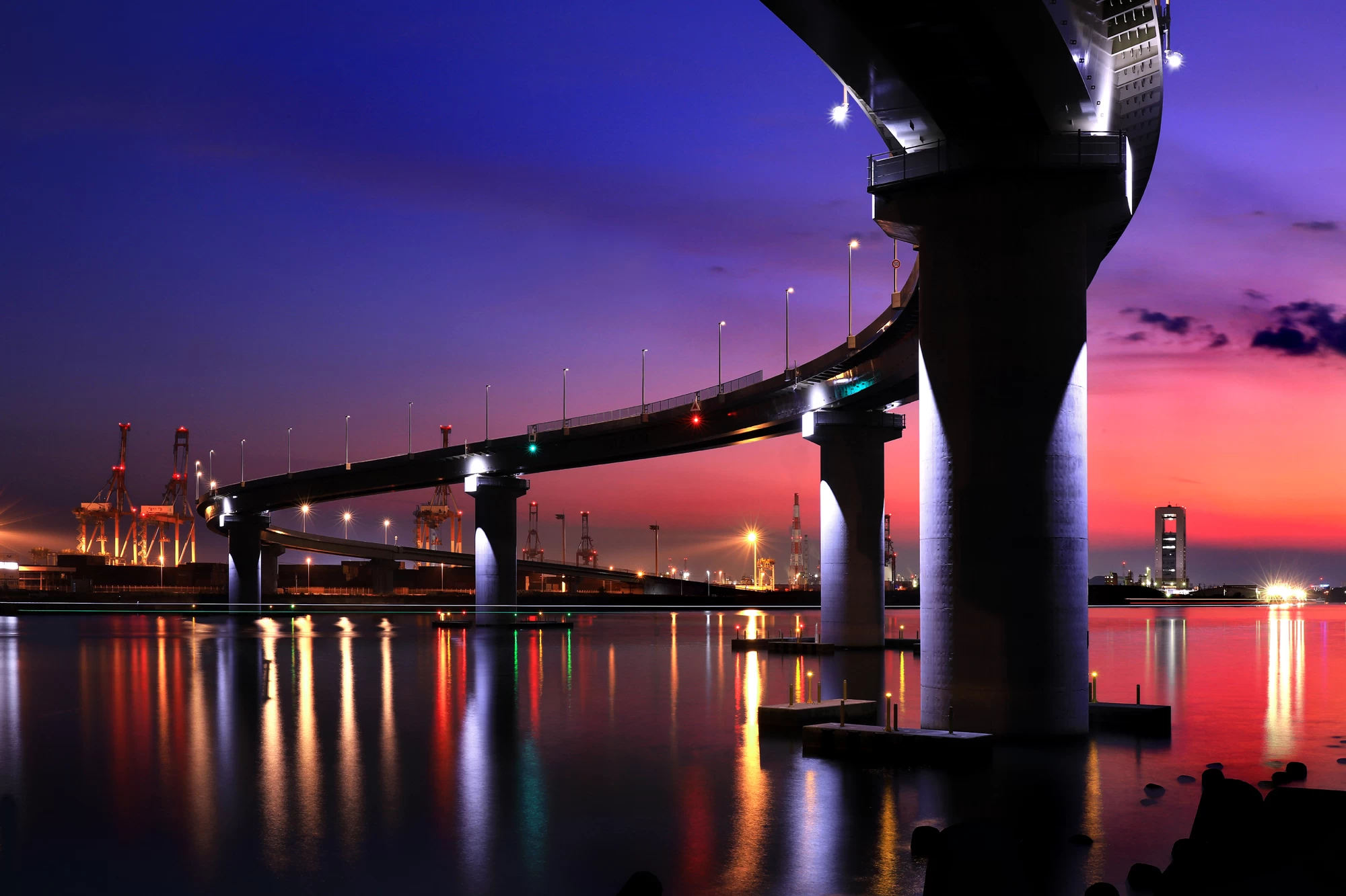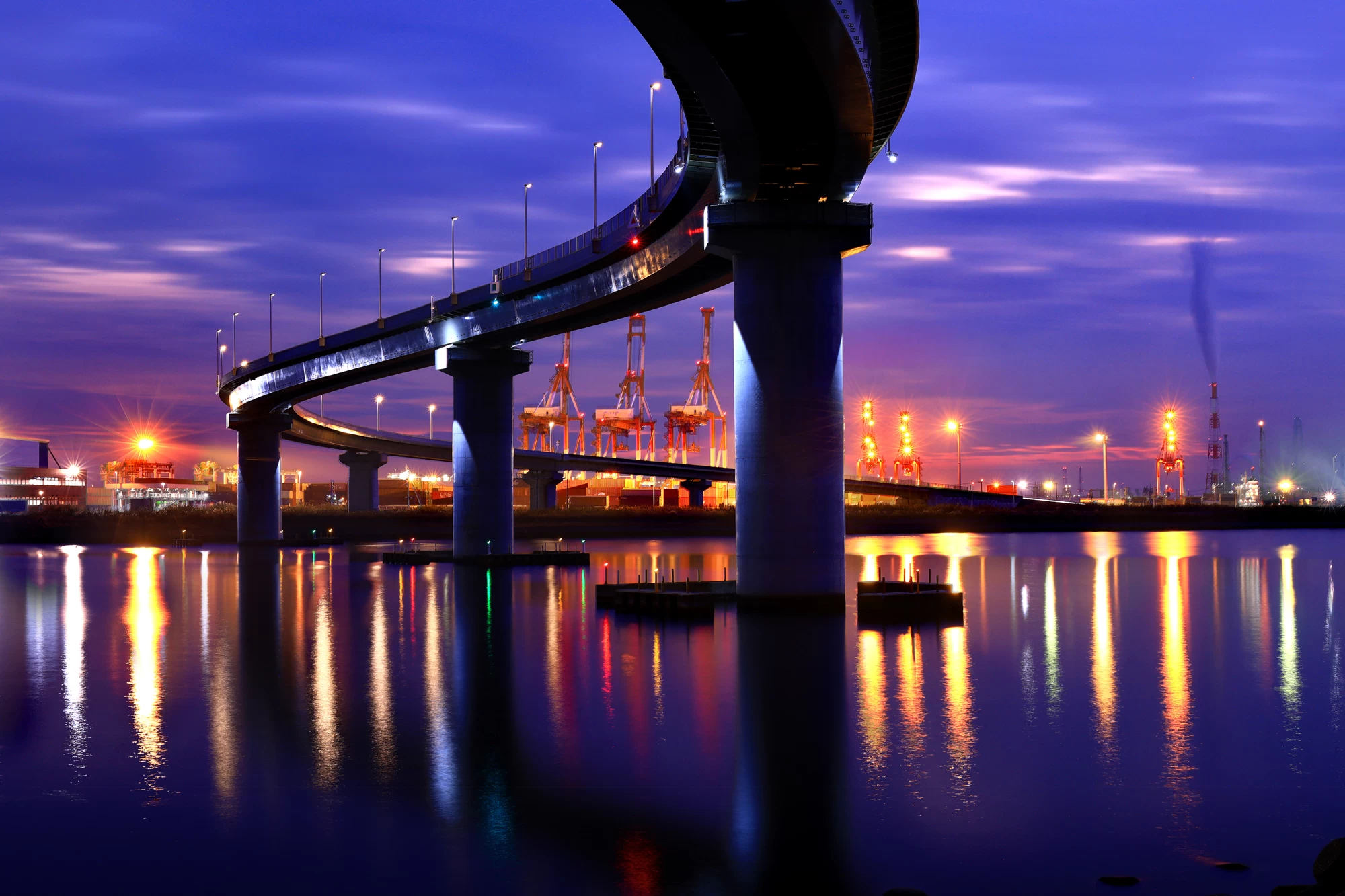 橋脚の下から奥には霞コンビナートの照明が広がり、手前にはコンテナターミナルが位置しています。その頭上を、大きくカーブを描く道路が走る構図が魅力です。なお、橋脚の上での撮影は大変危険なため、必ず橋脚下から撮影するようにしてください。