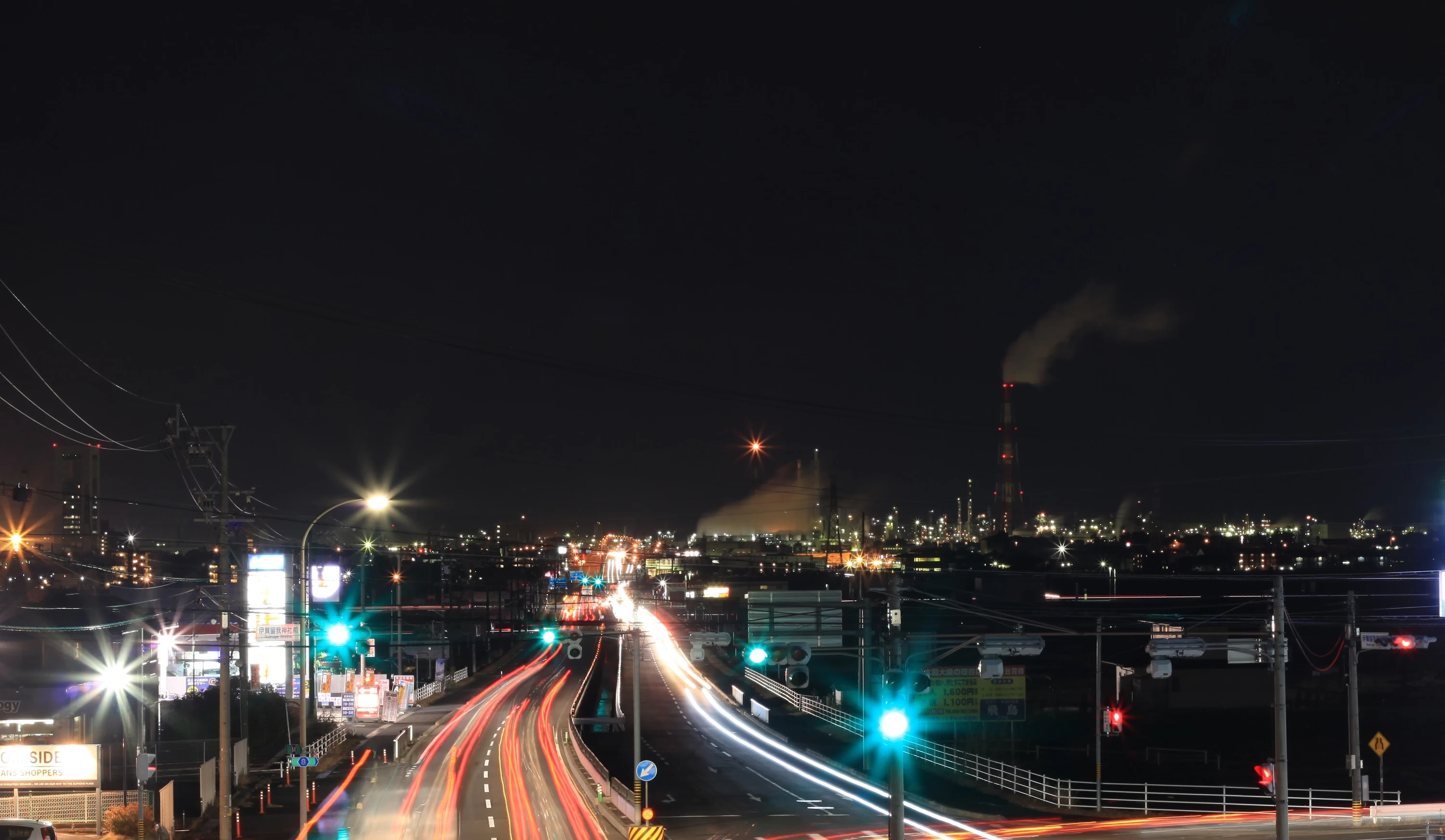 富田山城道路は、霞ヶ浦コンビナートから東名阪自動車道・四日市ICまで一直線に延びており、日常的にトラックやタンクローリーなどが多く行き交う交通量の多い道路です。そのため、走り去る車のライトの流れと、背景に広がる工場の照明が重なり合い、幻想的な風景を楽しめます。