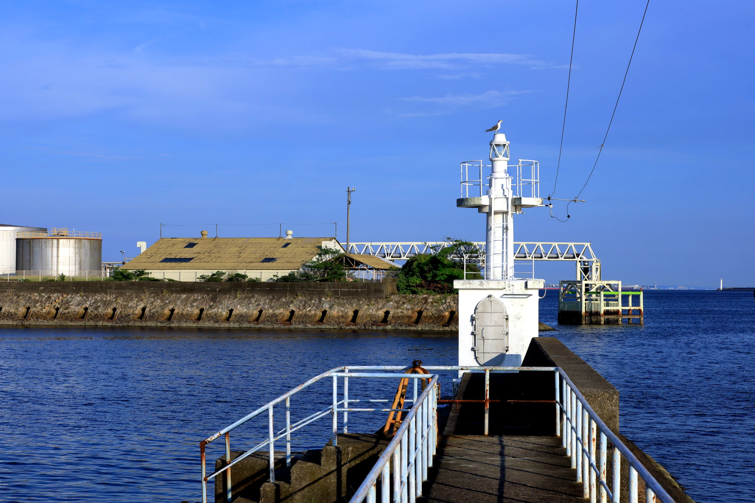 「磯津突堤」は鈴鹿川の河口にある堤防で、釣りを楽しむ方にも人気のスポットです。鈴鹿川の対岸に中部電力の変電所、昭和四日市石油の工場などがあり、その景色が観賞できます。