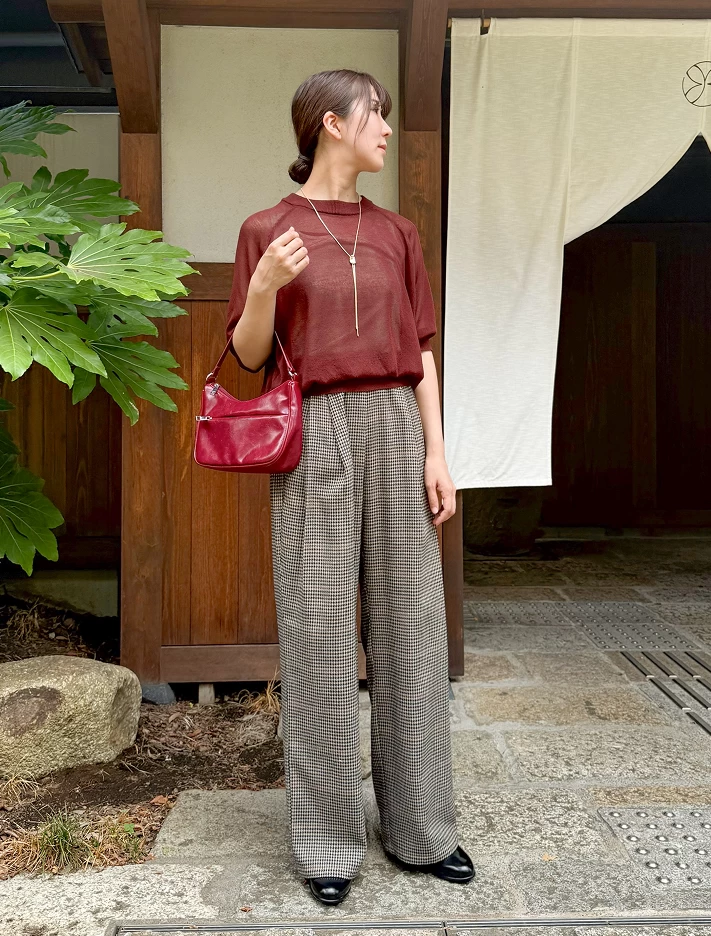 ボトムスにはクラシカルな千鳥柄パンツを合わせて、秋らしい表情をプラス。