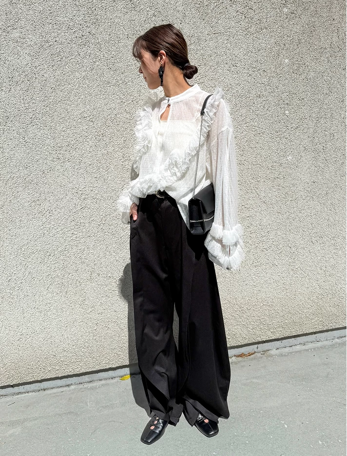 シルエットが個性的なブラックのタックパンツが全体をシックにまとめつつ、スタイルアップも叶うバランスに。