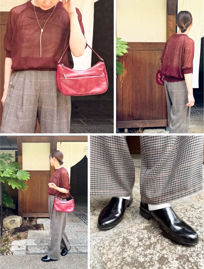 ボルドーのバッグを差し色に取り入れることで、全体がぐっと引き締まり、落ち着きの中にも華やかさを。