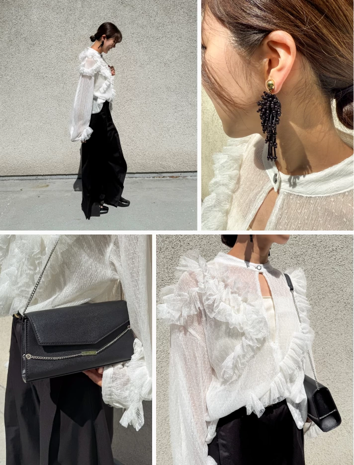 軽やかなシアー素材にフリルの柔らかさが、記念日にぴったりな華やぎを添えます。