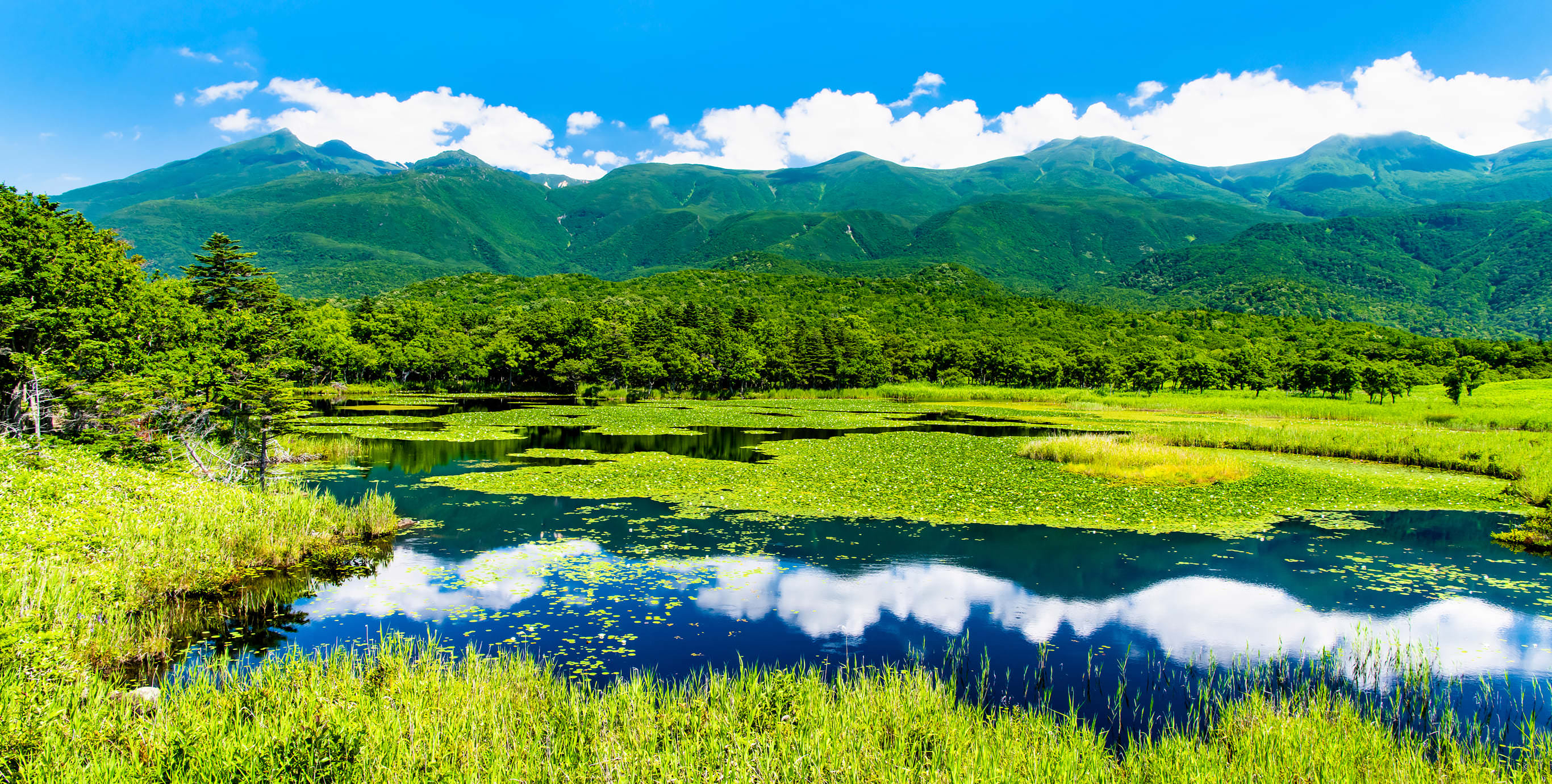 - 知床五湖では、原生林を背景に佇む5つの湖と知床連山が静寂の中で映し出され、風が止んだ瞬間には湖面が鏡のように木々や山並みを映す絶景が広がる。