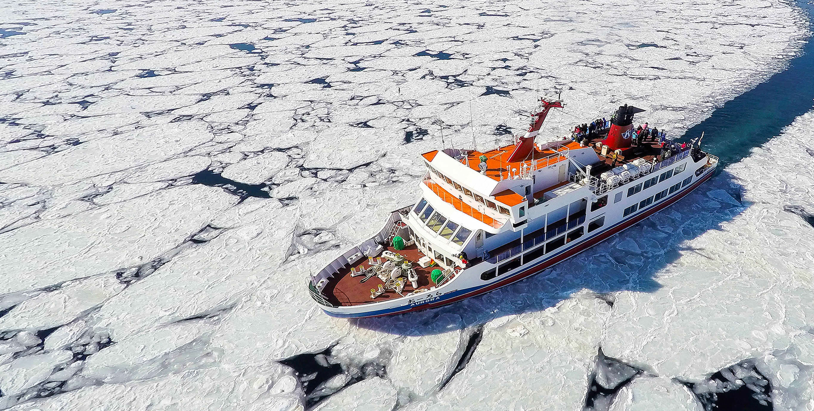 オホーツク海の流氷を砕き進む観光船です。船上からは白銀の絶景や迫力と感動に包まれる体験が楽しめます。冬の絶景クルーズをぜひお楽しみください。