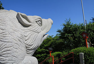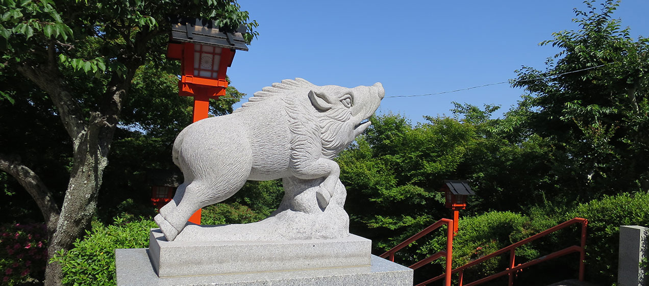鳥居をくぐり石階段を上ると、清麻呂公が猪に助けられたという逸話から、狛犬ならぬ狛猪が迎えてくれる。御神前にずらりと並ぶ「健脚わらじ」は、脚の治癒などの願掛けで昔から奉納するそう。全国でもめずらしい神仏習合の神社で、薬師堂の六体の仏像は必見だ。