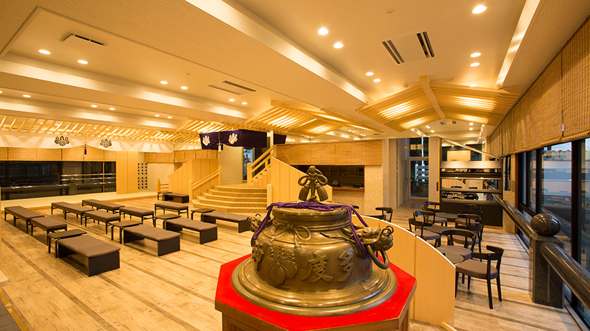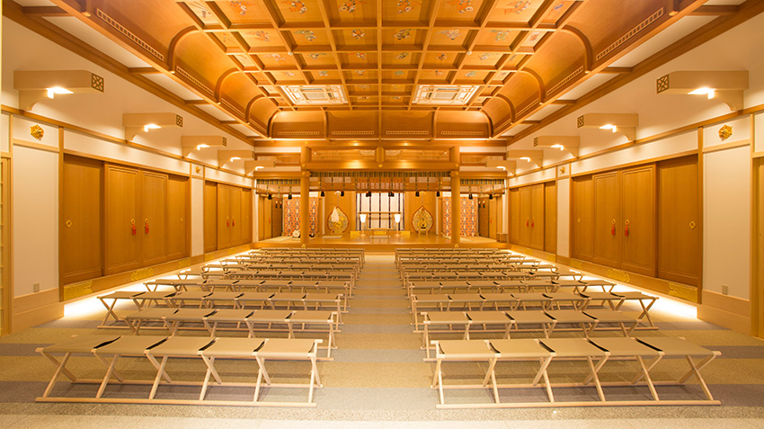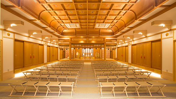 多度大社の社殿は、本殿・拝殿を中心とした多層的な構造になっているのが特徴。また神楽殿や儀式殿、多度祭御殿などの内部も社の歴史にふさわしい設えが施されている。特に儀式殿は、国幣大社列格100年にあたる2015年(平成27年)に改修。天井に日本画の技法で舞楽や雅楽器が描かれた雅な空間で、日々のご祈祷や御神楽が執り行われている。