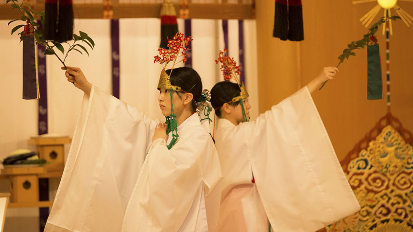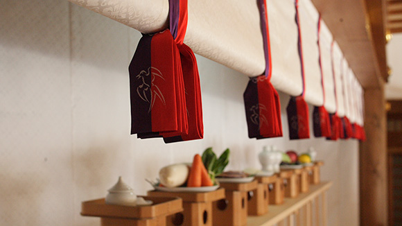 新穀を神前にお供えし、その年の五穀豊穣への感謝と、国家の平安と繁栄を祈願する。春の祈年祭とともに、重要なお祭りのひとつ。 |