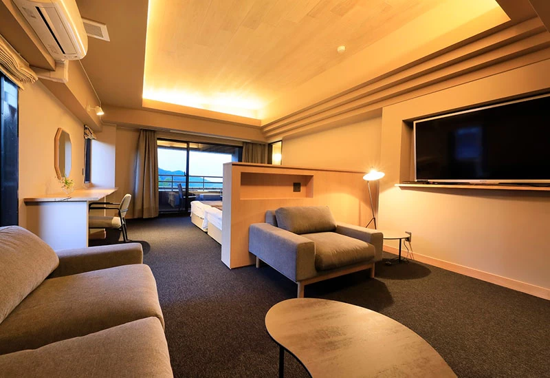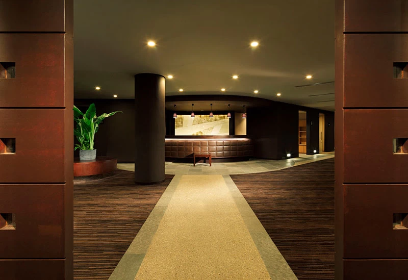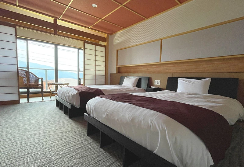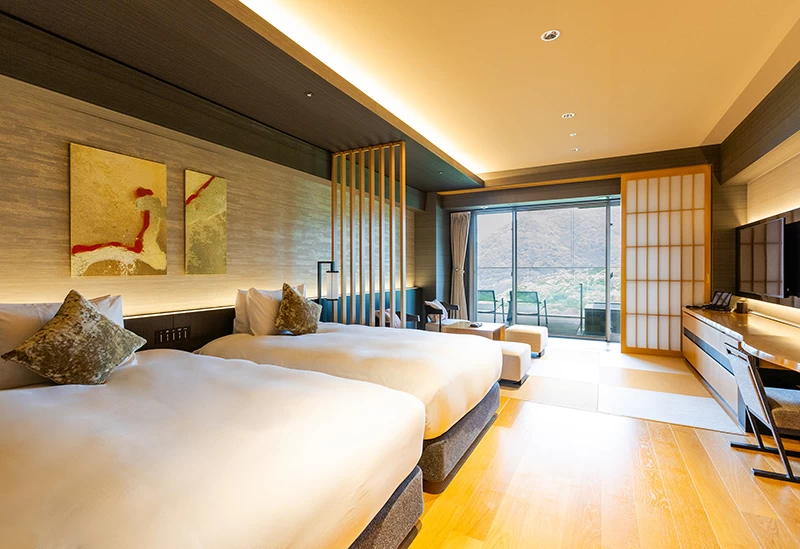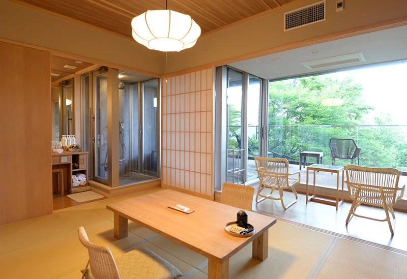 ダークブラウンを基調としたシックな和モダンの宿です。大涌谷から引く源泉掛け流しのにごり湯と本格イタリアン料理の組み合わせが特徴です。壁一面のガラス張りのダイニングで四季の景色を眺めながら味わうフルコースが好評です。