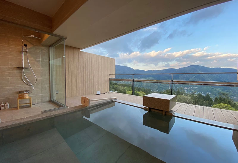 箱根連山と相模湾を見晴らす高台に佇む、全室温泉露天風呂付きの宿です。2024年にミシュランキーひとつを獲得しました。展望露天風呂「蒼海」「明星」、3つの貸切風呂も完備しています。ダイニング「六つ喜」の現代的日本料理と、グリルレストラン「十邑」の鉄板焼きコースも名高いです。
