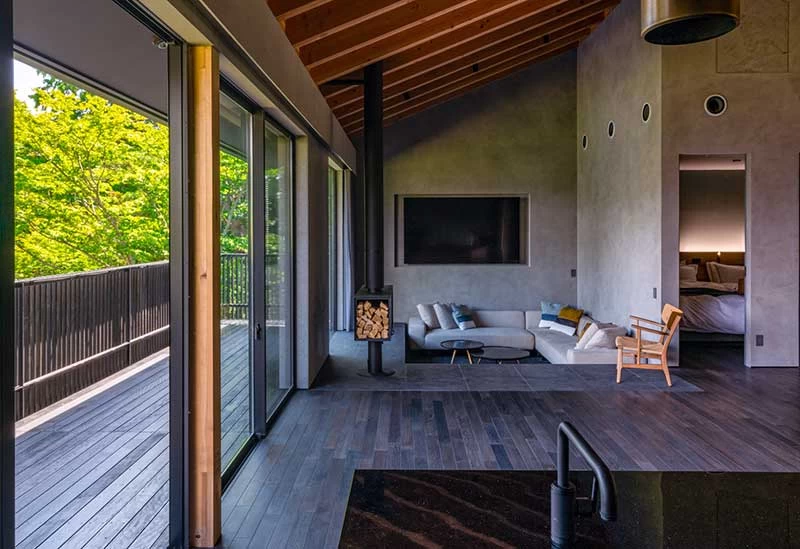 2023年6月に開業した2棟構成の1棟貸し施設です。テラス付き約350平米のラグジュアリーな空間に、源泉掛け流しの檜の半露天風呂、バーカウンター、真空管アンプのスピーカーなどこだわりの設備が揃っています。SOLIS棟ではガラス張りのフィンランド式サウナも体験できます。