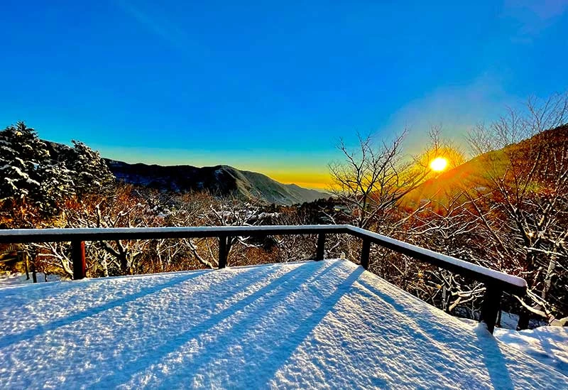 毎年8月16日に開催される強羅大文字焼は、大正10年から続く伝統行事です。外輪山の明星ヶ岳斜面に「大」の字が火で描かれ、旧盆の送り火と避暑客へのもてなしを兼ねて、地元有志の手によって今も受け継がれています。温泉宿の露天風呂から湯に浸かりながらこの光景を眺めるのは、強羅ならではの夏の一夜です。