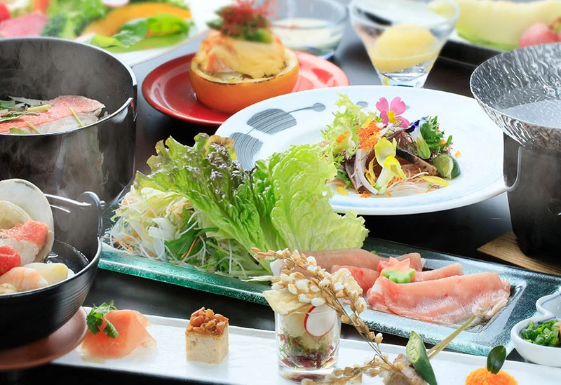 全9室すべてに露天風呂を備えた大人向けの宿です。ゆったりとした湯船で、好きな時間に自由に湯浴みができます。夕食・朝食ともに個室の食事処で提供される創作懐石料理は、近海の魚介や旬の食材を活かした内容です。