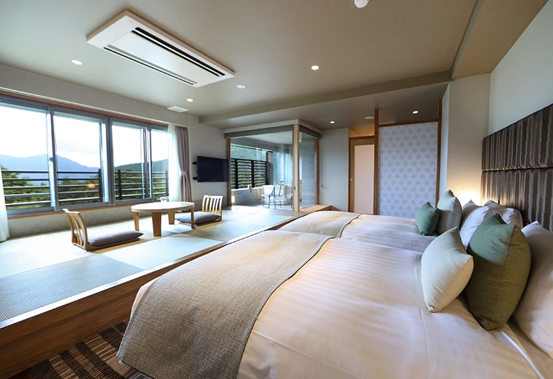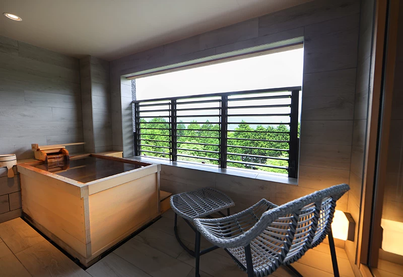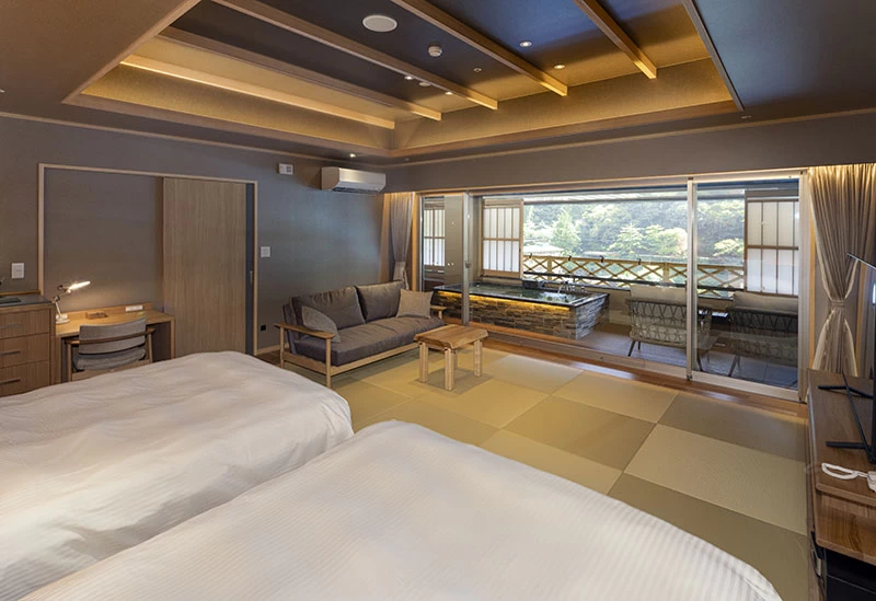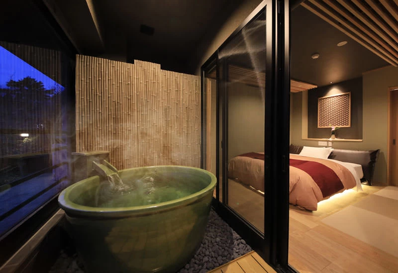 広々としたオープンテラス付きの客室では、露天風呂に浸かりながら自然を身近に感じる贅沢な時間を満喫できます。静かな環境のなかで心と体をゆっくり整えられる一軒です。