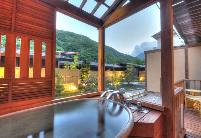 箱根湯本の豊かな自然に囲まれた、5本の自家源泉を持つ温泉宿。最大の特徴は、山景を望む露天風呂や足湯、さらに併設施設「湯の里おかだ」を合わせた計13種の多彩な湯めぐりが楽しめる点です。