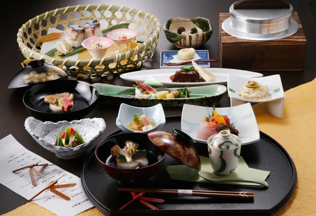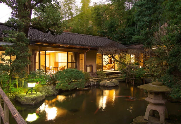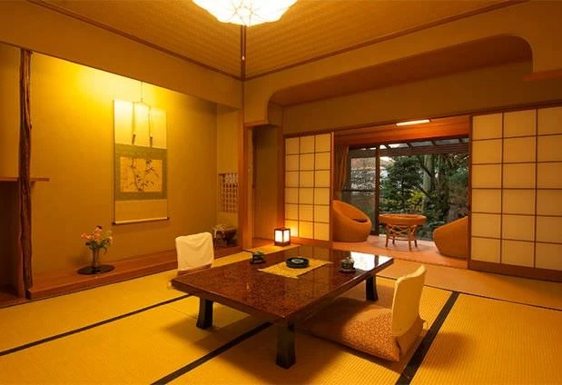 全室が三間続きのゆとりある京風数寄屋造りで、心ゆくまで名湯を堪能できる引湯の内風呂を完備。展望大浴場からの絶景を楽しんだ後は、旬の恵みを端正に仕立てた本格懐石に舌鼓。静寂に包まれた、大人の休息にふさわしい空間です。
