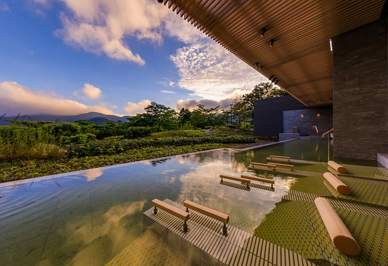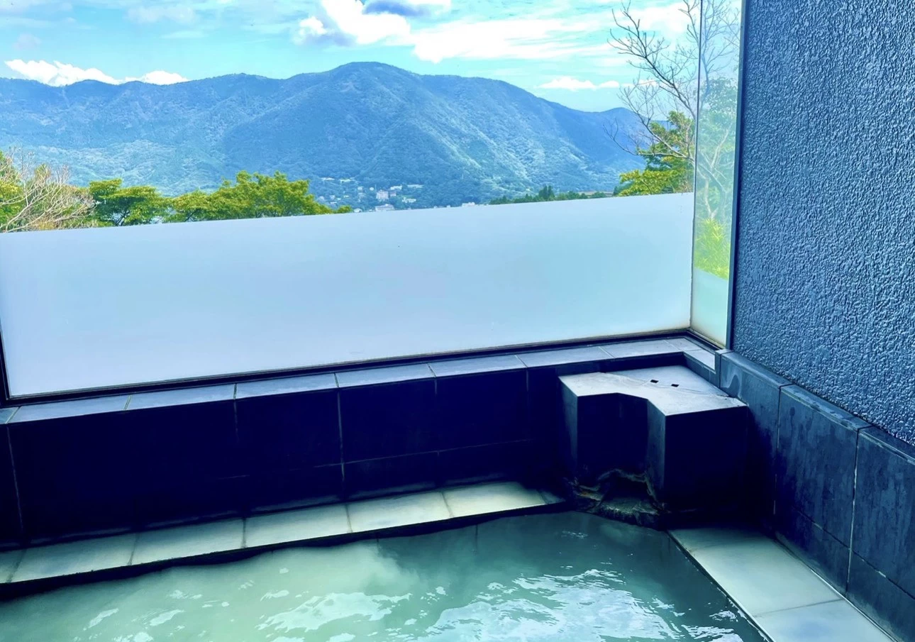 仙石原の高台に佇む「箱根湯宿 然-ZEN-」は、2014年開業の隠れ家宿。東京から最短90分で訪れられる立地にありながら、周囲には静かな別荘地の風景が広がります。全客室に半露天風呂を備え、富士山または箱根外輪山を望む贅沢な湯浴みが叶うのも魅力。