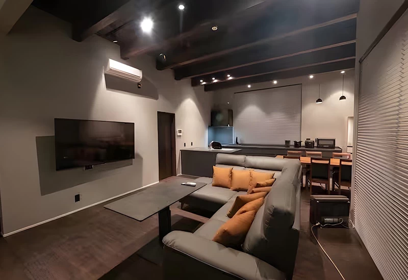母屋には開放感のあるリビングや設備の整ったキッチン、4つのベッドルームがあり、親子三世代や複数家族での滞在にも適しています。離れは茶室の趣を感じる和室で、静けさのなかでゆったり寛げる空間です。