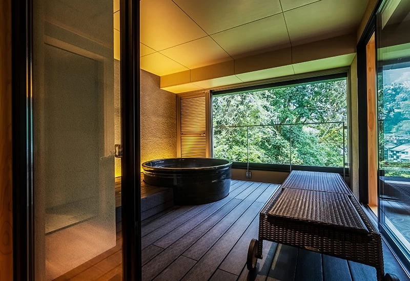 大浴場は、男性用に黒御影石、女性用に赤御影石を使用した広々とした造り。大浴場から続く露天風呂は、あえて湯温を少し低めに設定し、外の景色を楽しみながら、長く入浴できる工夫が施されています。夜には満天の星、冬には雪景色と、幻想的な風景が楽しめるのも魅力です。