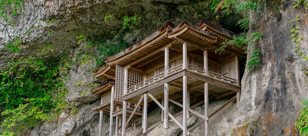 三徳山は、706年に役小角(役行者)によって開山されたと伝わる天台宗の古刹です。古くから修行の場として知られ、今もなお厳かな空気に包まれています。奥の院「投入堂」は国宝に指定されており、断崖絶壁の岩窟に建てられた、極めて特異な建造物です。役行者が山麓で堂を作り、強い法力によって岩窟へ投げ入れたという伝説が残るほどで、建築方法はいまだ解明されていません。