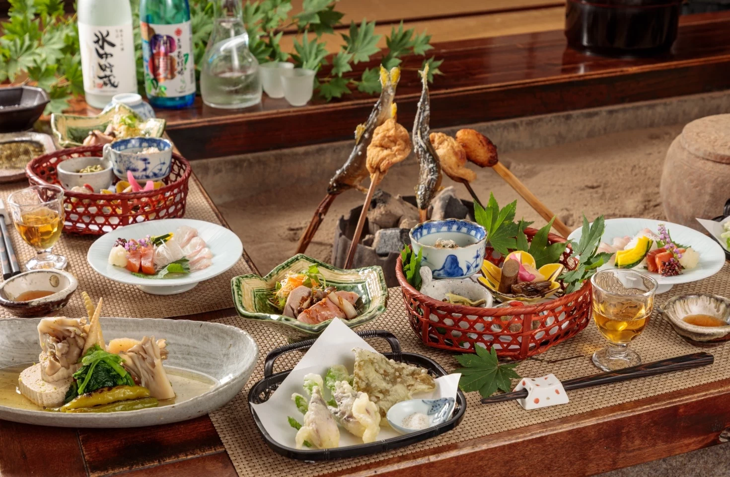 「隠庵 ひだ路(かくれあん ひだじ)」は、広大な敷地にわずか12室の客室がある開放的な隠れ宿です。すべての客室に、開放的な岩造りの露天風呂と檜造りの内湯が完備されており、気兼ねなく湯浴みできます。さらに、川沿いには貸切の露天風呂があるため、奥飛騨の四季を愛でながら日々の疲れを癒やせます。地元の食材にこだわった繊細な田舎料理を囲炉裏端で堪能できるのも嬉しいポイント。館内には、ワークスペースやミニギャラリー、お土産を販売しているお店もあり、充実した時間を過ごせます。