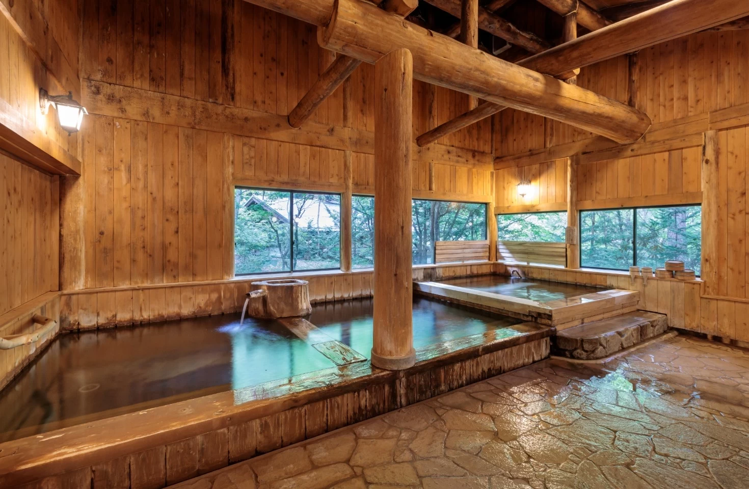 開放的な空間で湯浴みをしながら、奥飛騨の四季を眺める
