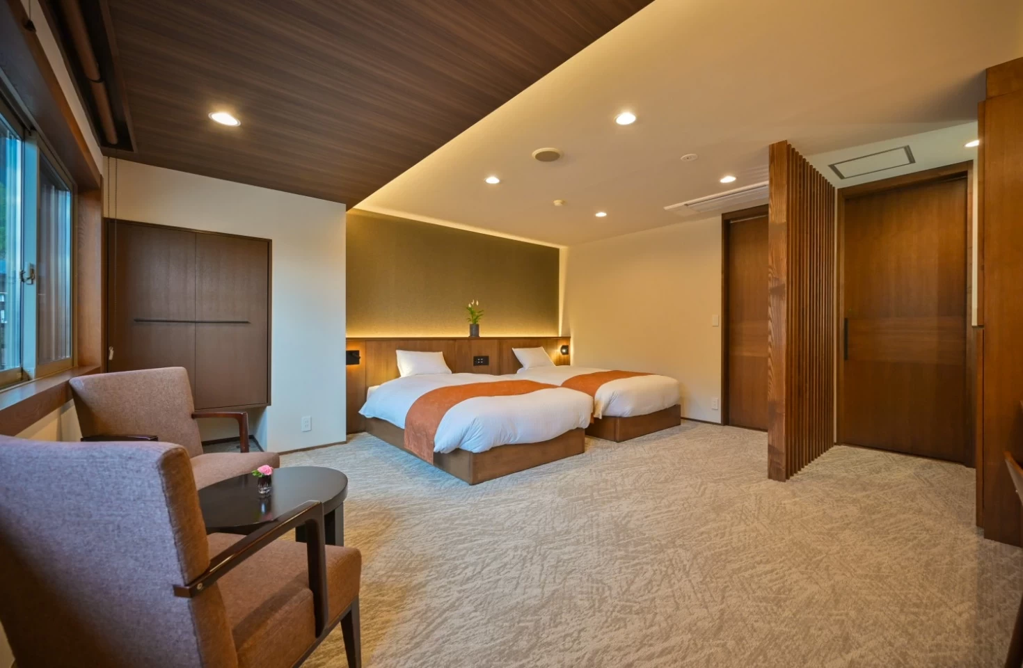 露天風呂付き客室や趣の異なる和室など、全9種類の客室を備える 「美湯美食の離れ宿 小野川温泉 河鹿荘」。四季折々の美しい景色を眺めながら、プライベートな時間を満喫できると好評の温泉宿です。離れには、源泉かけ流しの露天風呂付き和洋室 をご用意。シモンズ社製の心地よいベッドや本格的なコーヒーを楽しめるコーヒーマシン、全身マッサージ機を完備しており、旅の疲れを癒やします。夜には中庭と池がライトアップされ、幻想的な雰囲気に。ロマンティックなひとときを過ごしたいカップルにもおすすめです。