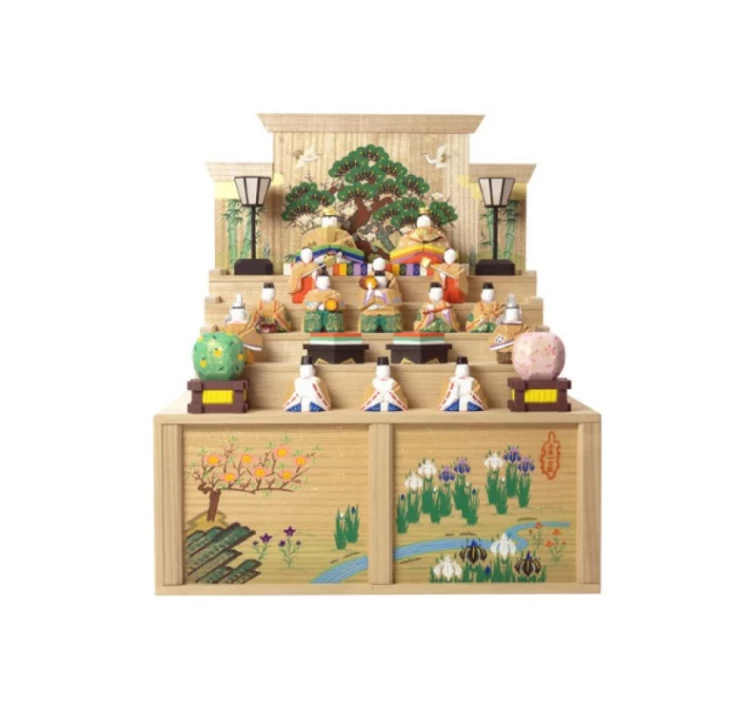 小さくても作りこまれた存在感が見る人の心をひきつけます。一体一体どこか個性を感じさせる顔立ちは一刀彫ならではの勢いを感じさせます。きちんと5段揃っており、雛祭りの世界を十分に堪能することが出来ます。また、下の段に人形やお飾りを全てしまうことができ、収納にも大変に便利です。