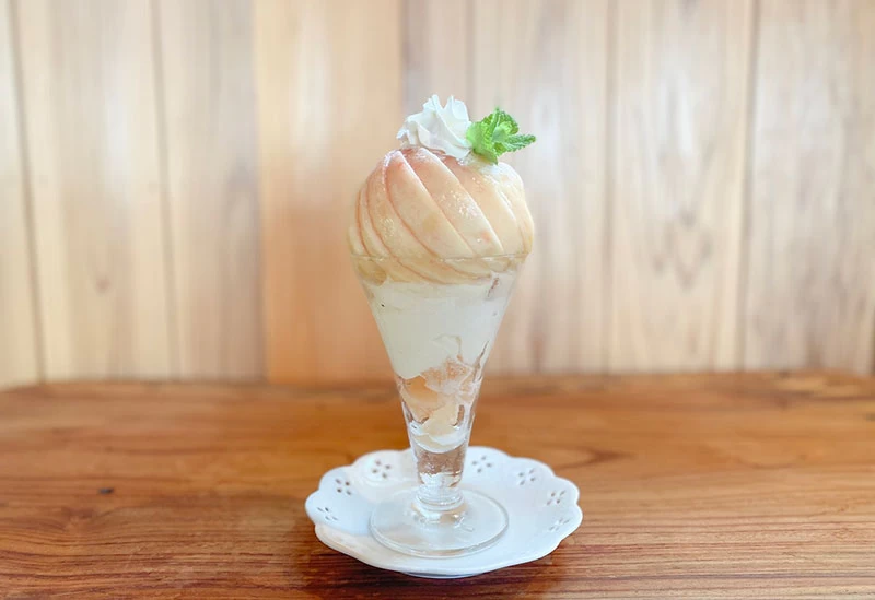 - ★ 木のぬくもりに癒やされる一軒家のログハウスカフェで小休憩はいかが? 桃やイチゴ、シャインマスカットなど、旬のフルーツを贅沢に乗せた季節限定パフェが人気。味はもちろん、見た目も華やかでフォトジェニックな一品です