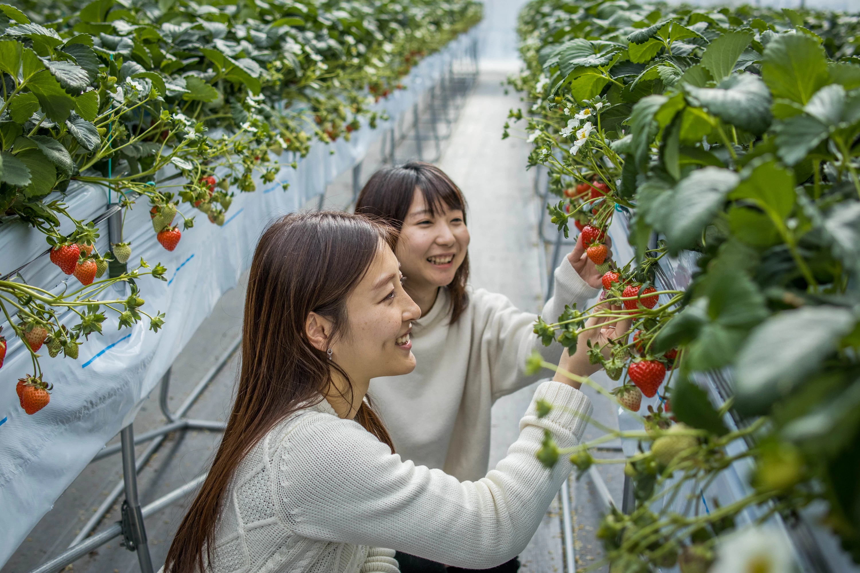 女性・子どもに優しく、いちご狩り+αを楽しめるコンテンツリッチな農園。温室内で育てられた甘みと酸味のバランスがよい人気の品種「恋みのり」などを中心に、自分でいちごを摘んで味わえる体験プランが用意されている。トッピングの種類も豊富で、その時々で中身が異なる「おまかせお土産」も提供。