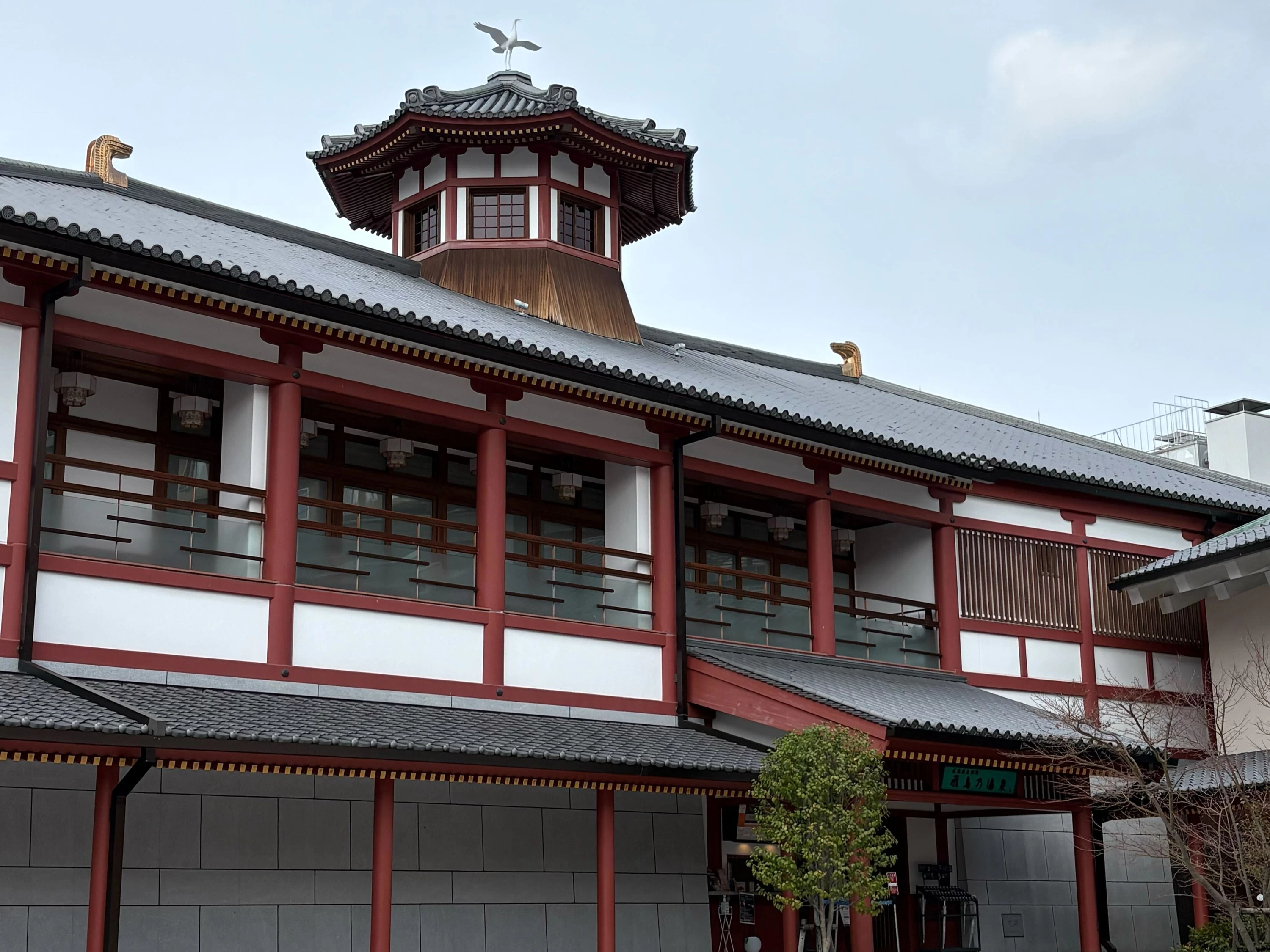 飛鳥時代の建築様式を取り入れた湯屋をコンセプトにしている。朱塗りの柱と白壁、屋根の上には金色の鳳凰、本館の又新殿を模した特別浴室や、露天風呂、愛媛県の伝統工芸やアート作品が館内の随所にある。