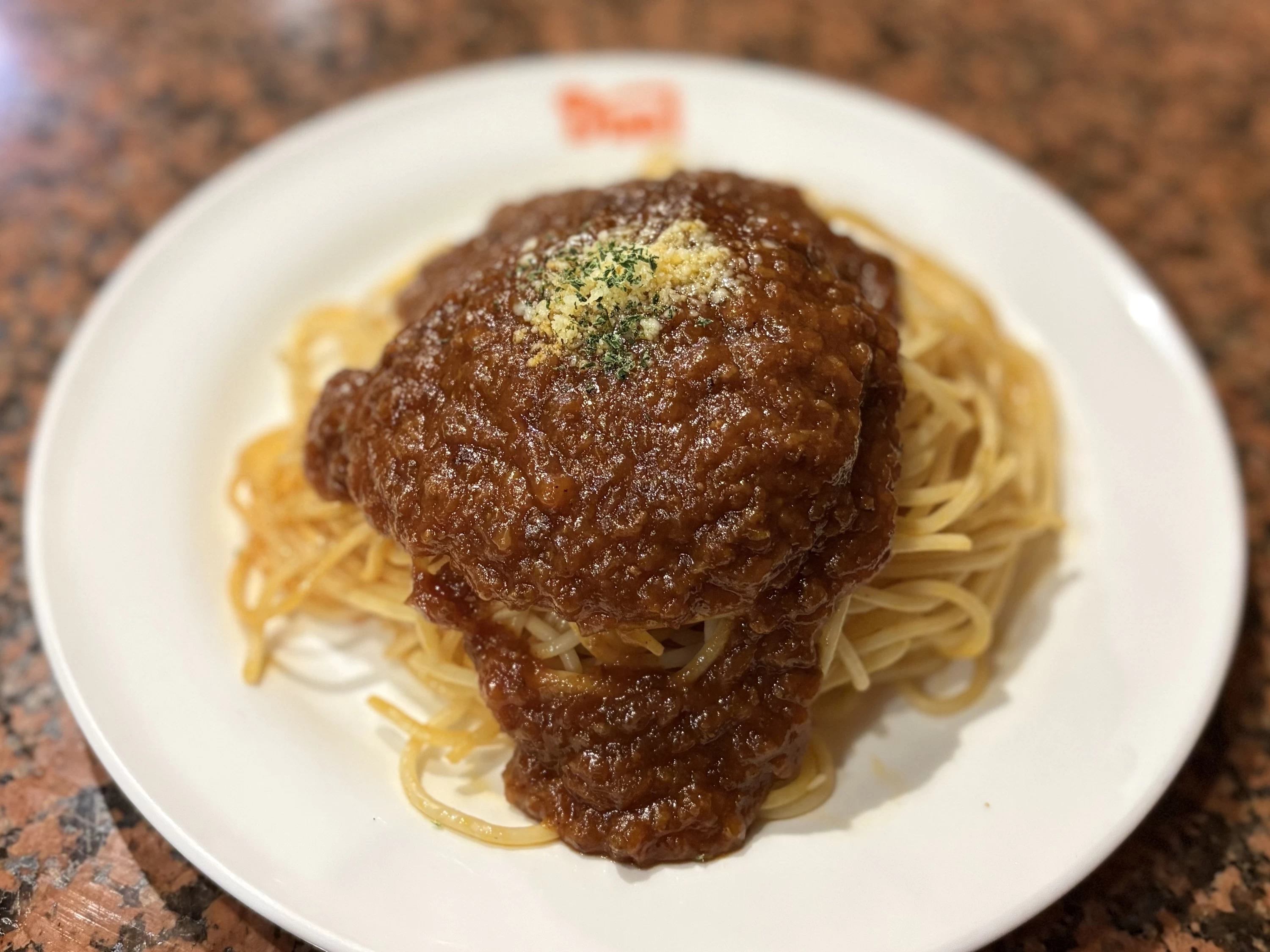 - ★ 茹でたスパゲティをフライパンで炒めてからソースを盛るため、細めの麺に甘いミートソースがよく絡む! デフォルトサイズが麺500g(茹で上がり)と大盛りで、小でも300gありますよ。お腹と相談しながらオーダーしてみて