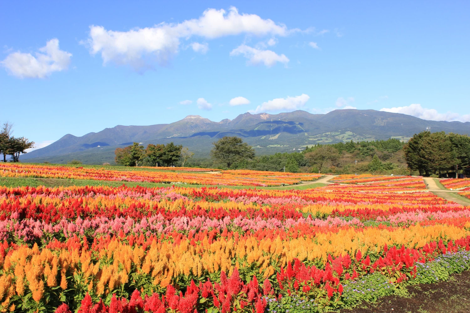 標高600mの高原に広がる花畑。春はネモフィラやアイスランドポピー、秋は約300万本のケイトウなど、那須連峰を背景に咲き誇る花の地上絵を眺めながら散策を。オープンテラスでソフトクリームを味わい一休みもOK。