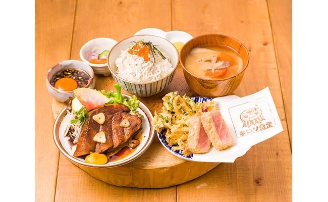 まずは、鎌倉駅近くの「鎌倉レンタサイクル駅前店」で自転車をレンタルします。「妙本寺」に立ち寄ったあとは、由比ヶ浜沿いにあるレストラン「海沿いのキコリ食堂」で昼食にしましょう。こちらでぜひ味わってほしいのが、鎌倉野菜のかき揚げや三崎マグロのレアカツがセットになった「オススメ全部のせ切り株定食」。そのほかには、一品料理や手ぶらバーベキューも満喫できますよ。