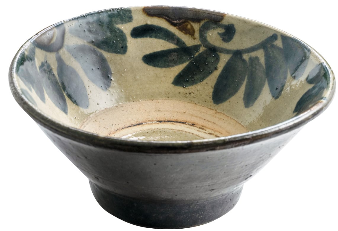 恩納村の森の中にひっそりと佇む窯で作られる、やちむんらしい存在感のあるうつわ。マカイとは「お碗」のことですが、うつわの底の高台(こうだい)が広く安定した形は沖縄独特のもの。内側に大胆に描かれた唐草模様は、沖縄そば、八重山そばはもちろん、素うどんなどシンプルなメニューも華やかに見せてくれます。