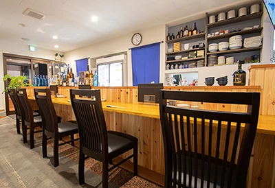 黄色いのれんが目印の「居酒屋 福籠(ふくろう)」。炭火で炙った季節の食材とおつまみを、お酒と共に楽しめます。国産若鶏の骨付き半身を素焼きした旭川の名物料理「新子焼き」は、国産鶏の半身をスチームコンベクションオーブンと炭火焼きの二段階で中までふっくら焼き上げるこだわりの逸品。ジューシーな鶏肉と、試行錯誤して作り上げたタレとの相性も抜群です。このほか、もつ鍋やしゃぶしゃぶなどの鍋料理も充実しており、宴会にぴったりの飲み放題コースもあります。