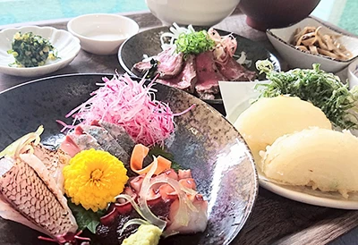 兵庫県洲本市、サントピアマリーナ近くにある「かふぇ食堂 おるか」は、淡路島の海鮮と手作りスイーツが楽しめる一軒。地元・由良漁港で一本釣りされた天然地魚を中心に、新鮮な魚介を盛り付けた「おるかの海鮮丼」は、タイやアジ、タコ、サワラなど、季節ごとに異なる旬の味わいが楽しめます。ご飯の量はそのままに、魚の具材を増量した“贅沢盛り”も人気です。海鮮と肉料理の両方を味わえる「おるか御膳」には、天然地魚のお造りや淡路牛のローストビーフ、名産のタマネギを使った天ぷらなどが並び、淡路島の味覚を一度に堪能できます。お酒との相性も良く、観光の晩酌にもぴったりです。地元産の厳選素材を使った手作りスイーツは、食後のデザートやカフェタイムに最適。店内はカウンター席のみで、子ども連れやひとりでのランチにも利用しやすいアットホームな雰囲気。観光客をはじめ幅広い客層に親しまれており、席数が限られるため予約がおすすめです。