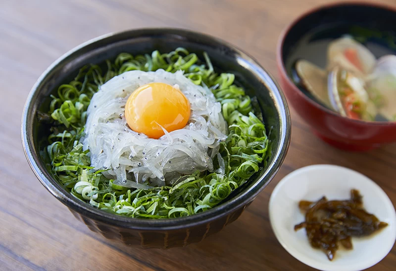 兵庫県淡路市・室津港のほど近くに店を構える「えいしん」は、タイ漁で知られる釣り船会社「栄真丸」が営む食事処です。夏はタコ、秋はカワハギ、冬はタイといった旬の魚介が毎日水揚げされ、その場でさばかれた新鮮な味を楽しめます。ランチタイムには海鮮丼や天丼を中心とした定食を、夜には店主こだわりの鶏のたたきなど居酒屋スタイルの料理を提供しています。朝に釣り上げたタイを、“鬼締め冷やし込み”という技法で仕上げたプリプリとした食感を、海鮮丼で堪能してください。看板メニューの「鯛潮ラーメン」も、素材と丁寧な調理が活きた一杯です。店内は初めての方でも実家のようにくつろげる温かみのある空間。子ども連れにうれしい座敷席のほか、お1人様でもゆったり過ごせるカウンター席も用意されています。潮風が心地よい季節には、テラス席から海を眺めながら新鮮な海の幸を味わうのもおすすめです。