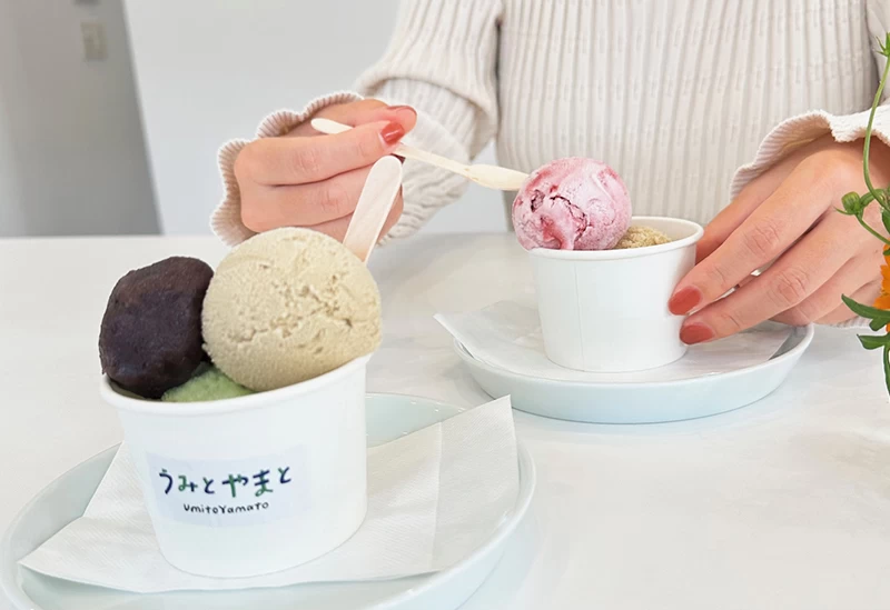 広島県呉市広長浜の「うみとやまと」は、瀬戸内海と山に囲まれたギャラリーカフェです。白を基調とした開放的で明るい店内には大きなテーブルが置かれ、ドライブ中の休憩におすすめです。カフェでは、瀬戸内らしさを感じる「藻塩ミルク」などのフレーバーを用いた「うみとやまと手作りジェラート」が楽しめます。ほかにもホットサンドイッチや焼きたてワッフルなどを味わえ、テイクアウトも可能です。店内では絵の展示や様々なワークショップが日常的に開催されており、家族も笑顔になれる空間を提供しています。