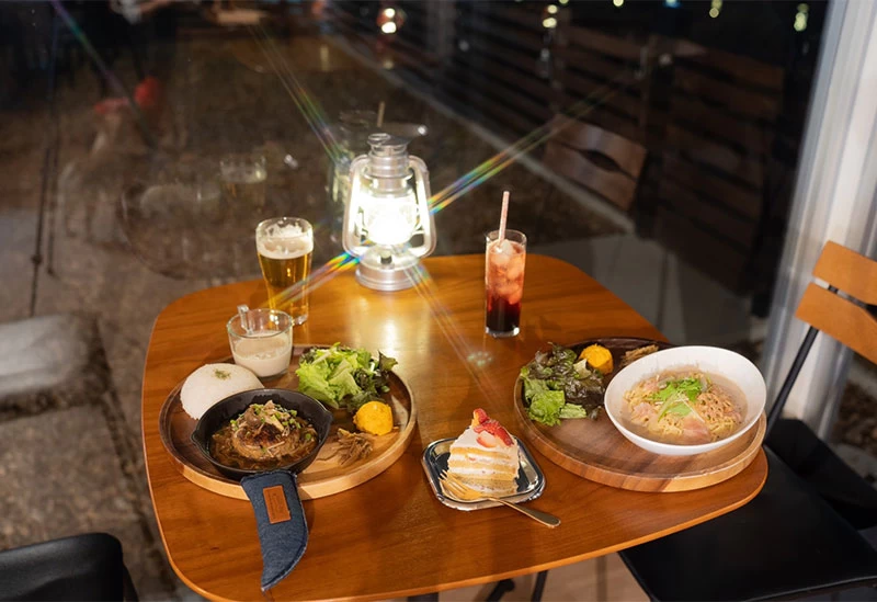 最大の特徴は、カフェ飯の枠を超えた本格的な「大分県の郷土料理」が味わえること。オーナーの出身地の味を再現した名物「とり天セット」は、サクサクのとり天、吉野の鶏めし、だんご汁が一度に楽しめる満足度の高いメニューです。ほかにも、トマトソースでじっくり煮込んだハンバーグや、韓国風かき氷「糸ピンス」、バスクチーズケーキなど、食事からスイーツまで充実しています。