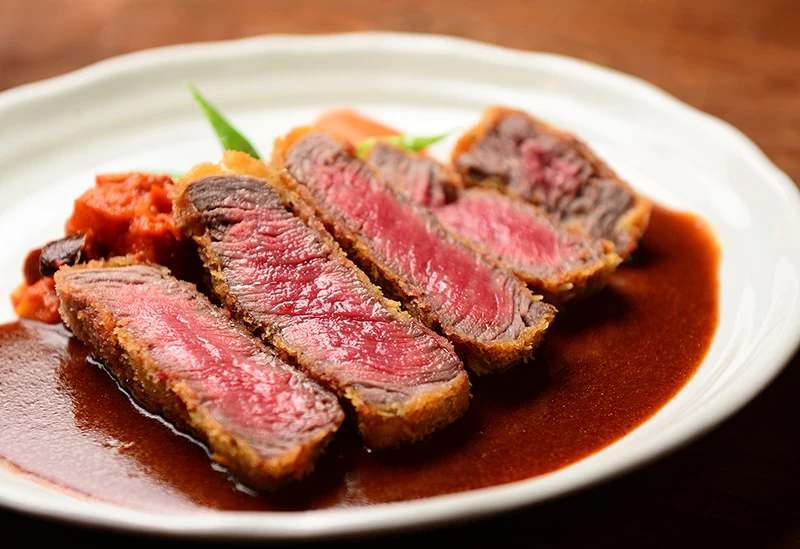 厳選された和牛を使ったステーキやビフカツ、ビーフシチューなど、多彩な肉料理が楽しめます。ランチメニューの「はふう特選ビフカツ」は、やわらかな肉質と濃厚な旨味が特徴で、噛むほどに風味が広がります。ディナーでは、好みに応じて選べるコース料理を用意しています。また、レアに揚げた分厚い牛フィレのビフカツと新鮮な野菜で仕上げた「極上カツサンド」は、冷めても美味しくいただける工夫が施されており、見た目も美しく自分へのご褒美にピッタリです。店内はマホガニー調のカウンターや赤白のラインが映える厨房、アンティーク家具を配したテーブル席など、細部にまでこだわった落ち着いた空間。個室も備えているため、記念日や家族の食事、ビジネスシーンにもおすすめです。