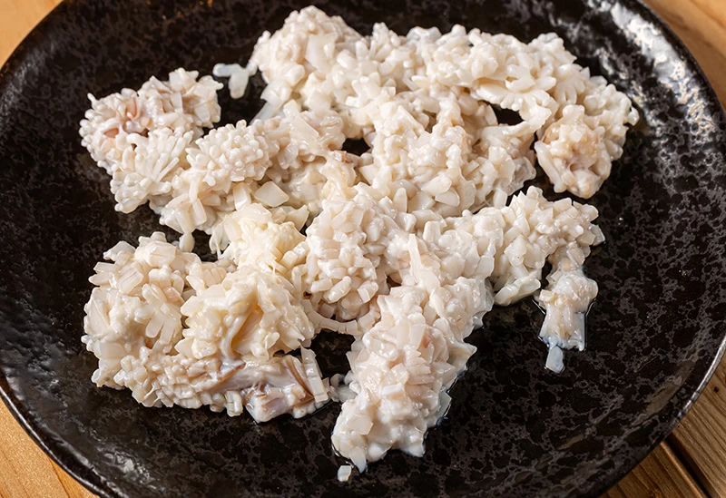 “美唄焼き鳥”とは、鶏のさまざまな内臓部位をタマネギで挟み、ひとつの串に刺して焼いた鳥串のこと。北海道美唄市の郷土料理で、函館で提供しているのは貴重だそう。串は3種類の炭を使用して一気に焼き上げるので、外はカリッと、中はジューシーに仕上がります。鶏肉の旨味を引き出すため、塩とコショウのみで味付けするのが店主のこだわりです。