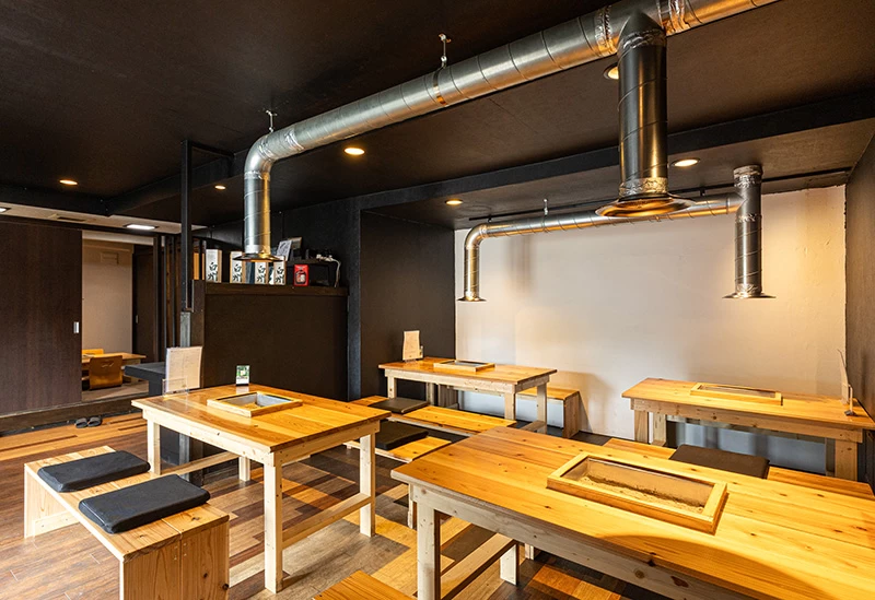 赤ちょうちんが下がり、昭和のレトロな雰囲気が漂う店内には、調理のライブ感が楽しめるカウンター席のほか、テーブル席、座敷席を完備。おひとり様から宴会まで、さまざまなシーンに合わせて利用できます。